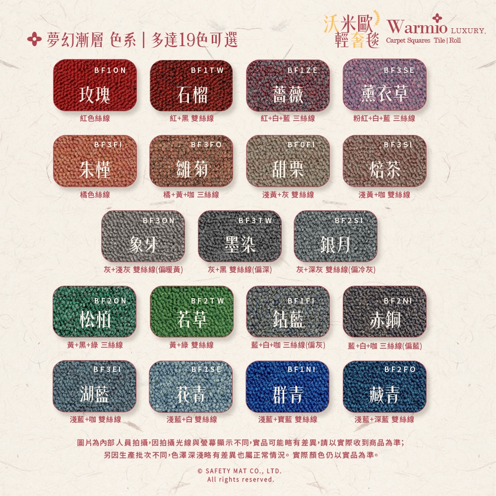 • 大面積覆蓋設計,密實富彈性,踩踏感紮實舒適。 採用高克重短芯絨結構,耐磨抗污、色澤持久,不易翹邊變形。 表面經 3M 防污處理,污垢不易附著,日常清潔更省力。 超寬大片尺寸,減少接縫,整體鋪設更美觀。